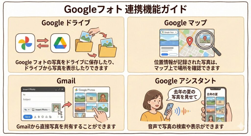 Google フォトは他のGoogleサービスとシームレスに連携しています。特にGoogle ドライブとの連携は便利で、写真や動画を簡単に共有・管理できます。