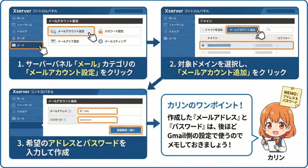 作成した「メールアドレス」と「パスワード」は、後ほどGmail側の設定で使うのでメモしておきましょう。