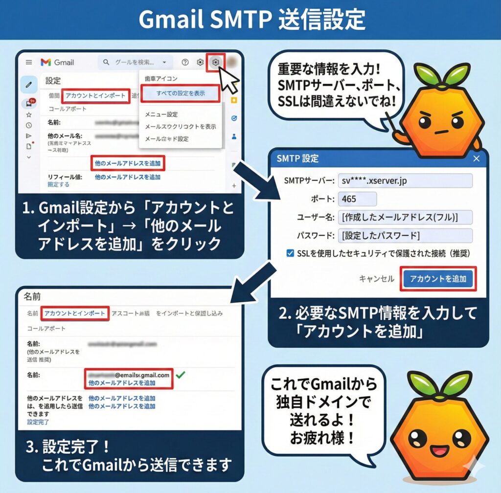 2026年1月より、Gmailの「POP取り込み」機能が一部制限されているため、現在はエックスサーバーからの転送とGmailのSMTP送信を組み合わせる方法が最も確実でスピーディーです。