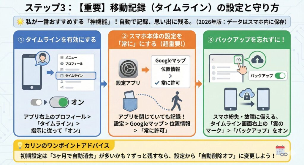 ステップ3:【重要】移動記録(タイムライン)の設定と守り方