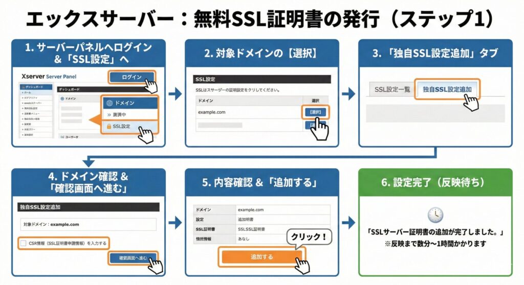 エックスサーバーでウェブサイトを「https://」(SSL化)にする方法は、大きく分けて2つのステップが必要です。
