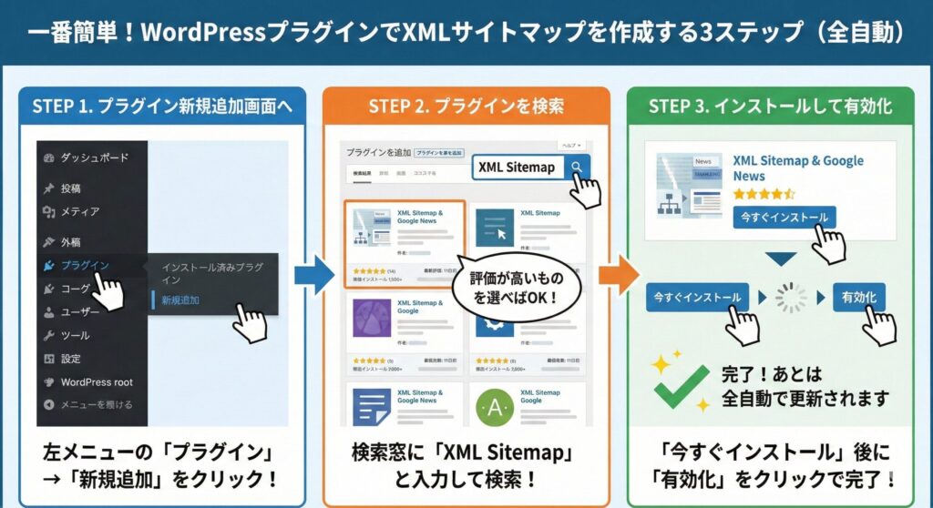 WordPressなら、便利な「プラグイン」を入れるだけで、誰でも全自動で作成できます。