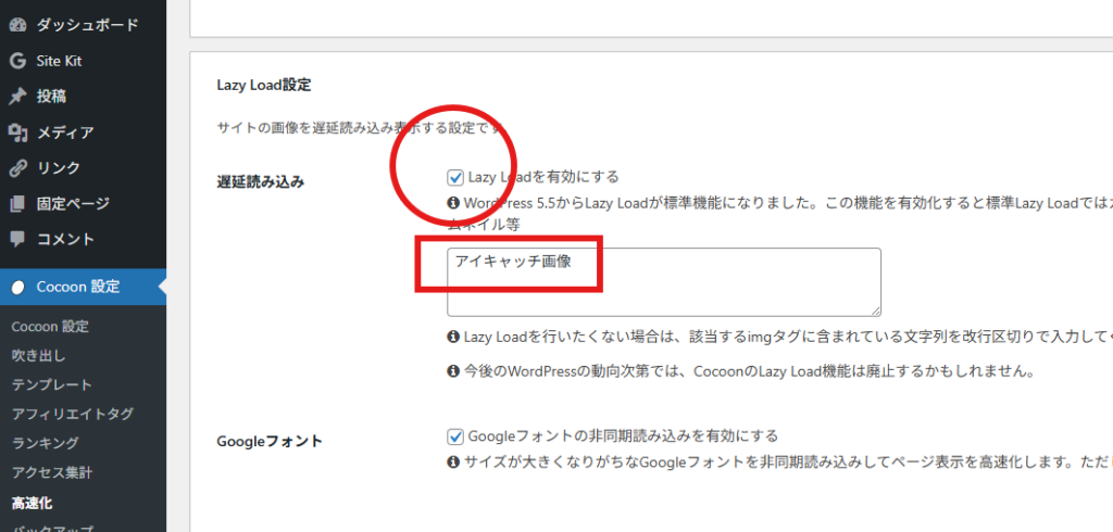 - 「Cocoon設定」>「高速化」タブの「Lazy Load」セクションにある、「Lazy Load除外設定」欄を探します。