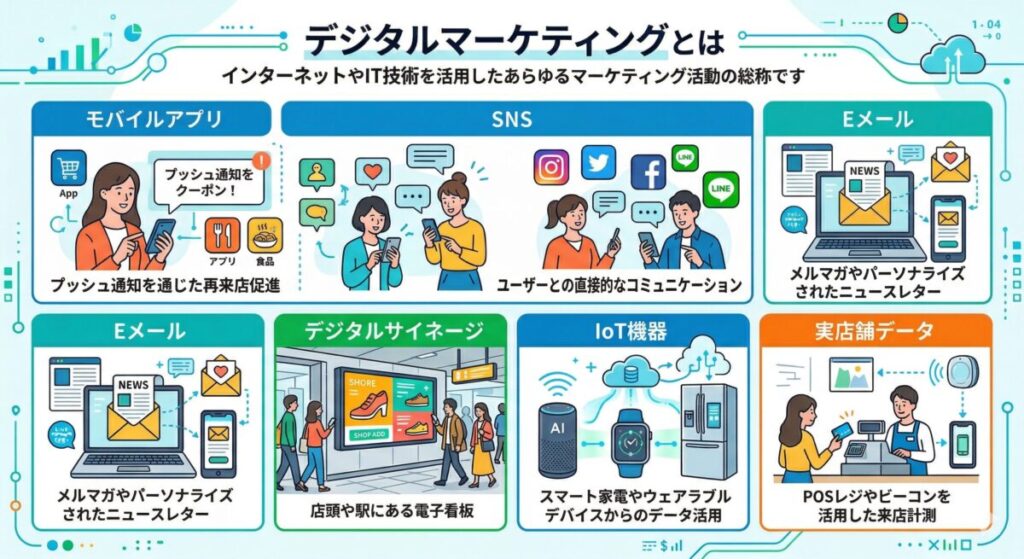 - デジタルマーケティング: オンライン(Web)とオフライン(実店舗、看板、センサー)を統合し、顧客一人ひとりの行動を「データ」でつなげて最適化する広義の活動です。