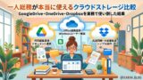 特に、KARIN BLOGでも「一人総務が本当に使えるクラウドストレージ比較」という記事で詳しく紹介されているように、それぞれのサービスには特徴がありますので、ご自身の使い方に合ったものを選ぶと良いでしょう。